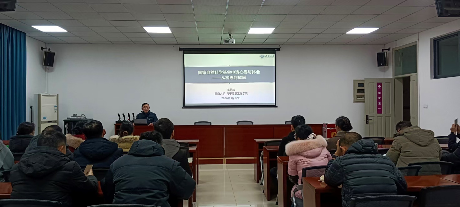 为进一步推动2026年度国家自然科学基金项目申报工作,助力教师提升项目书撰写质量与立项成功率,1月22日下午,西南大学电子信息工程学院车杭骏副教授应邀在厚德楼G408作了题为“国家自然科学基金申请心得与体会——从构思到撰写”的专题辅导报告。学院拟申报2026年度国家自然科学基金项目的教师积极参加本次报告。