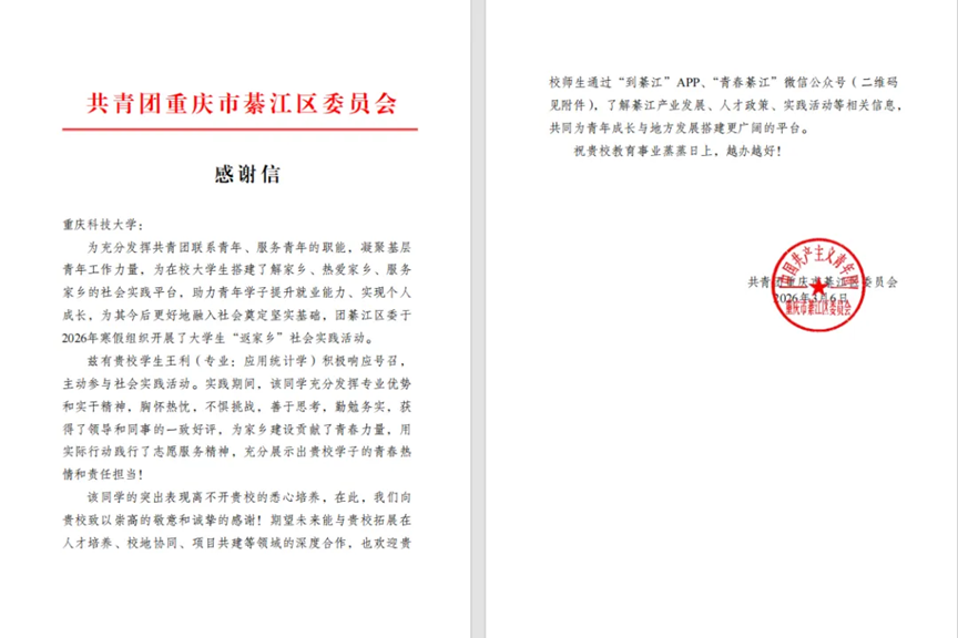 近日,共青团重庆市綦江区委员会发来感谢信,充分肯定数理科学学院应用统计学2025级学生王利在寒假“返家乡”社会实践活动中的优秀表现。